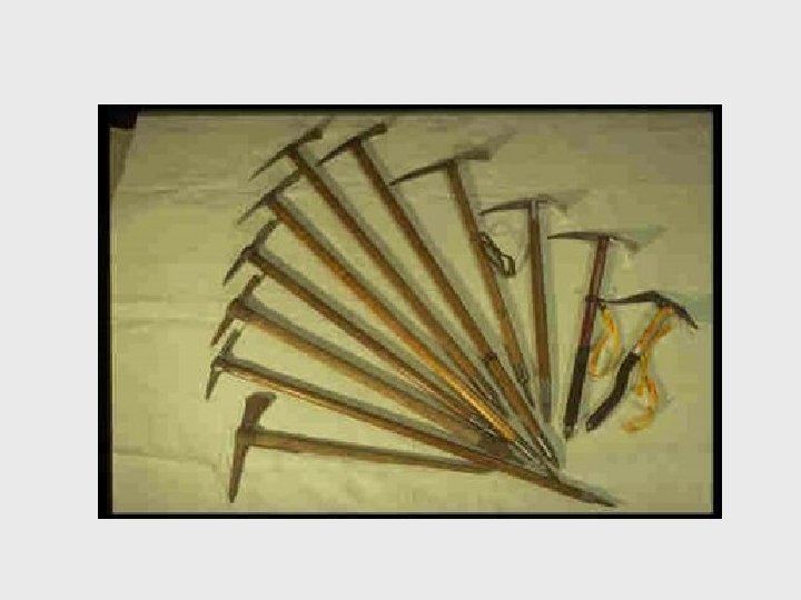 ٧ PARA ASEGURAR Mango Importante como estaca. Más largo, más profundidad Empuñadura Peor cuanto más voluminosa Dientes próximos al mango Mal rozamiento cuerda COMO HERRAMIENTA AUXILIAR ٧ Maza Mejor recto que curvo, y no muy largo Escalones y escarbar nieve OTROS FACTORES Peso Coste Estética Mejor mango no muy corto ٧ ٧