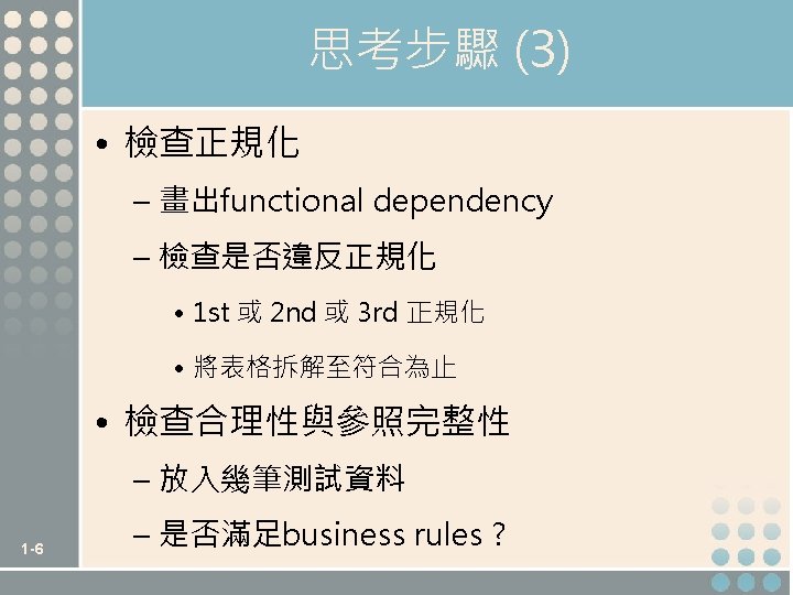 思考步驟 (2) • 轉換成表格 – Entity轉表格 – 各種Relationship的轉法 • 不同degree – unary 或 binary 或 ternary • 不同cardinality – 1: 1 或 1: N 或 M: N • Relationship上是否有屬性 1 -5