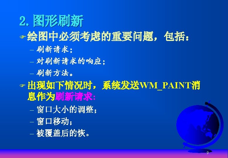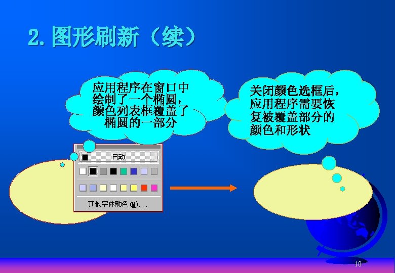 Select. Object(h. DC, h. Brush); //选入画刷. Select. Object(h. DC, h. Pen); //选入画笔. l. Centre. X=lp. Sin[i]. x; //圆心x坐标. l. Centre. Y=lp. Sin[i]. y; //圆心y坐标. Ellipse(h. DC, l. Centre. X-l. Radious, l. Centre. Y-l. Radious, l. Centre. X+l. Radious, l. Centre. Y+l. Radious); //画圆 i++; Delete. Object(h. Pen); //删除画笔 Delete. Object(h. Brush); //删除画刷 End. Paint(h. Wnd, &Pt. Str); //删除设备环境指针 Sleep(100); //停 0. 1秒 if(i<100) Invalidate. Rect(h. Wnd, NULL, 1); //刷新用户区 return 0; case WM_DESTROY: //关闭窗口. Post. Quit. Message(0); return 0; default: return(Def. Window. Proc(h. Wnd, i. Message, w. Param, l. Param)); } } 53