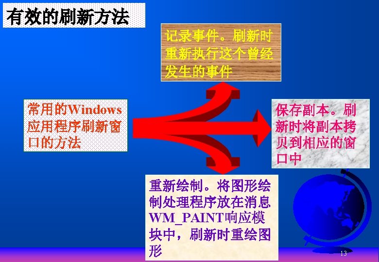 BOOL Init. Windows(HINSTANCE h. Instance, int n. Cmd. Show)//初始化窗口 { HWND h. Wnd; h. Wnd=Create. Window("Win. Fill", //生成窗口 "填充示例程序", WS_OVERLAPPEDWINDOW, CW_USEDEFAULT, 0, NULL, h. Instance, NULL); if(!h. Wnd) return FALSE; h. Wnd. Main=h. Wnd; Show. Window(h. Wnd, n. Cmd. Show); //显示窗口 Update. Window(h. Wnd); return TRUE; } 42