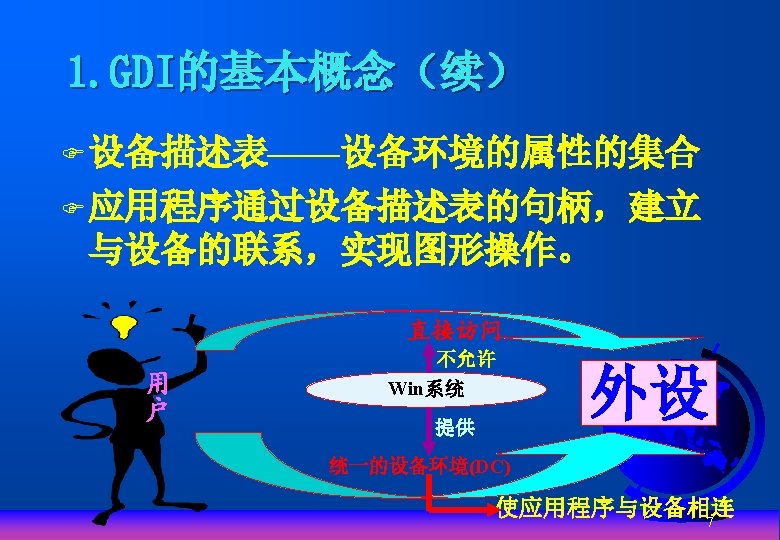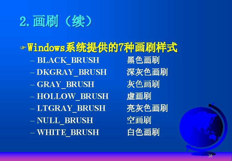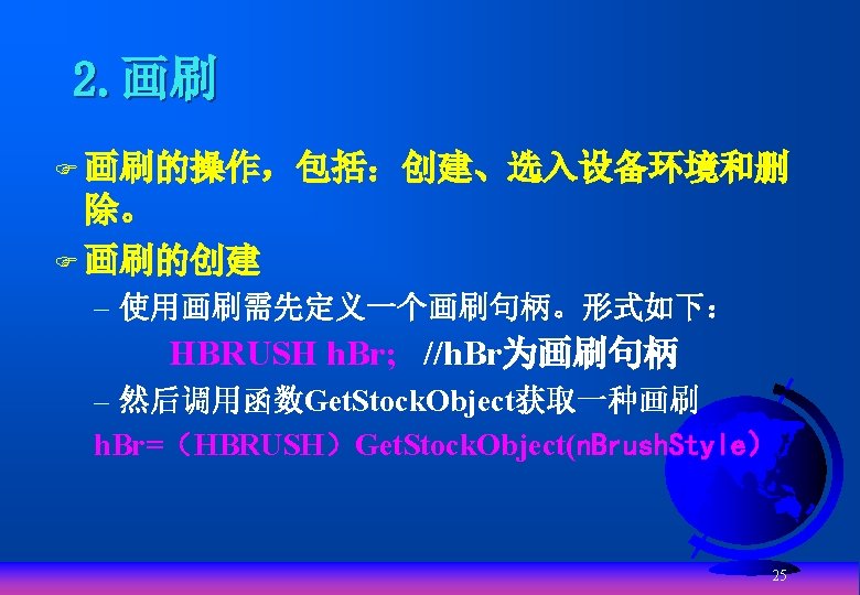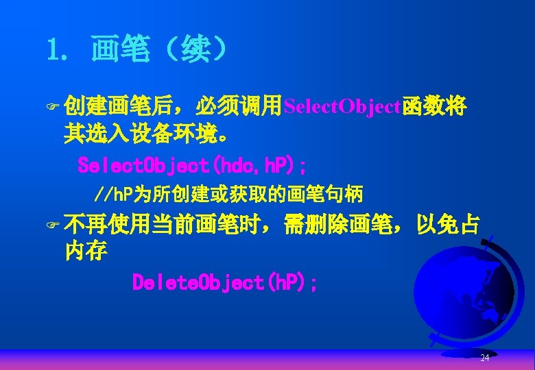 1. 画笔(续) F 也可创建新画笔, 形式如下: h. P=Create. Pen ( int n. Pen. Style, int n. Width, COLORREF rgb. Color ); PS_DASH: 虚线 PS_DASHDOT: 点划线 PS_DASHDOTDOT:双点划线 PS_DOT: 点线 PS_INSIDEFRAME:实线 PS_NULL: 无 PS_SOLID: 实线 //确定画笔样式 //画笔宽度 //画笔颜色 23
