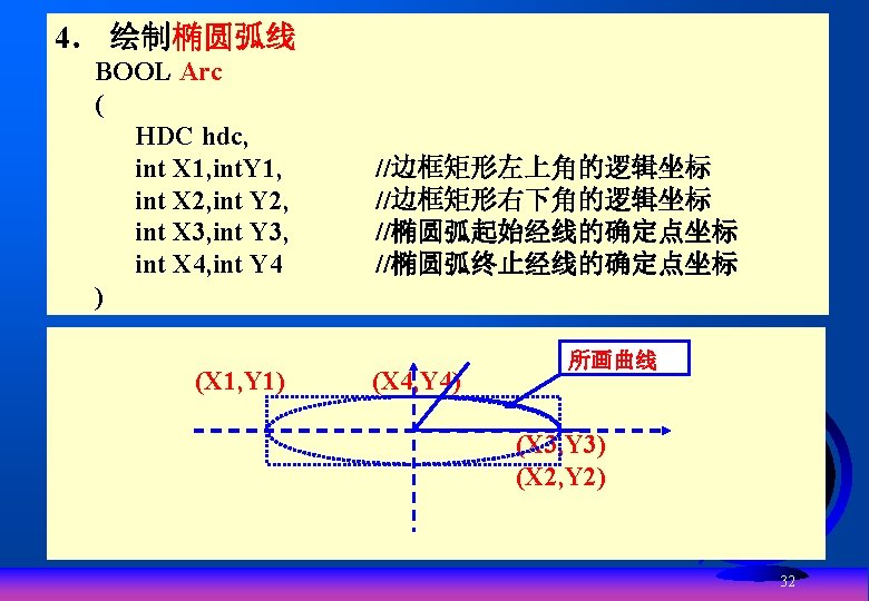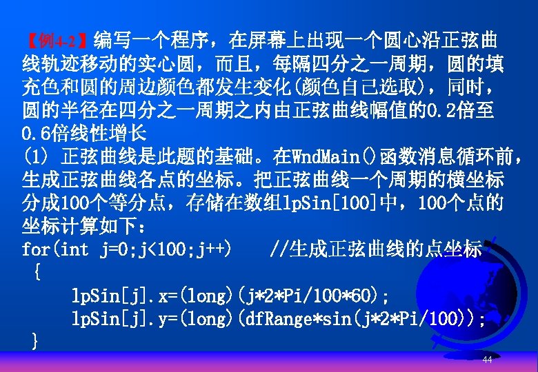 #include <windows. h> #include <stdlib. h> #include <string. h> #include <math. h> #define Pi 3. 1415926 long WINAPI Wnd. Proc(HWND h. Wnd, UINT i. Message, UINT w. Param, LONG l. Param); double df. Theta=0, df. Range=100. 0; //正弦曲线的角度变量. long i=0, j=0; long l. Centre. X=0, l. Centre. Y=0, l. Radious=(long)(0. 2*df. Range); //定义圆心坐标和圆坐标. POINT lp. Sin[100]; //定义正弦曲线的点坐标. 48