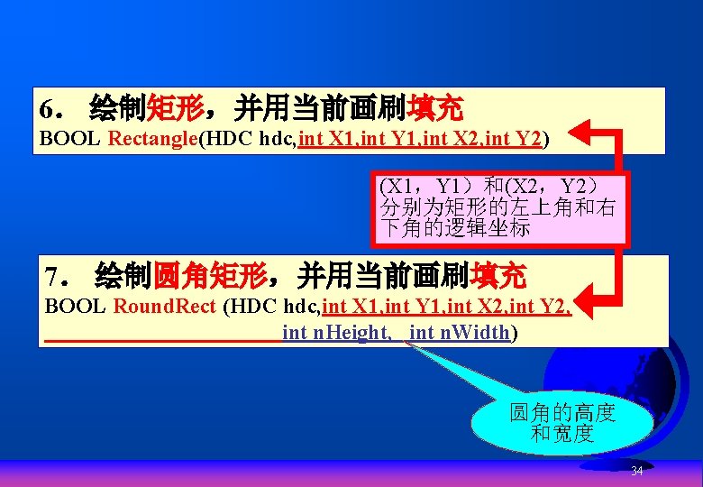 8. 绘制椭圆,并用当前画刷填充 BOOL Ellipse(HDC hdc, int. X 1, int. Y 1, int. X 2, int. Y 2) 9.绘制多边形,并用当前画刷填充 BOOL Polygon(HDC hdc, LPPOINT lp. Points, int n. Count) 包含各点坐标的 POINT数组的地址 多边形点的个数 35