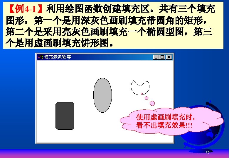 Select. Object(h. DC, h. Pen); //选择画笔 Round. Rect(h. DC, 50, 120, 100, 200, 15); //绘制圆角矩形 h. Brush=(HBRUSH)Get. Stock. Object(LTGRAY_BRUSH); //亮灰色刷 Select. Object(h. DC, h. Brush); //选择画刷 Ellipse(h. DC, 150, 200, 150); //绘制椭圆 h. Brush=(HBRUSH)Get. Stock. Object(HOLLOW_BRUSH); //虚画刷 Select. Object(h. DC, h. Brush); //选择画刷 Pie(h. DC, 250, 300, 100, 250, 300, 50); //绘制饼形 End. Paint(h. Wnd, &Pt. Str); //结束绘图 return 0; case WM_DESTROY: //结束应用程序 Post. Quit. Message(0); return 0; default: //其他消息处理程序 return(Def. Window. Proc(h. Wnd, i. Message, w. Param, l. Param)) ; } } 41