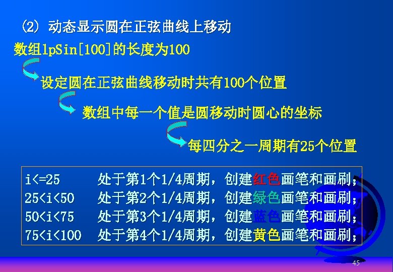 在消息WM_PAINT处理程序中,调用函数Begin. Paint()获得 设备环境句柄。由此经过线性差分计算圆半径的大小 l. Radious,第 1个 1/4周期的程序代码如下: if(i<=25) //第一个 1/4周期 { h. Pen=Create. Pen(PS_DASH, 1, RGB(255, 0, 0)); //红笔 h. Brush=Create. Hatch. Brush(HS_BDIAGONAL, RGB(255, 0, 0)); //红刷 //计算半径 l. Radious=(long)(df. Range*0. 2+i%25*df. Range*0. 4/25); } ……. 46