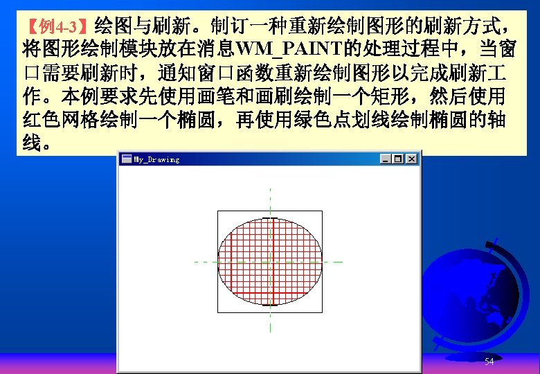 LRESULT CALLBACK Wnd. Proc(HWND hwnd, UINT message, WPARAM w. Param, LPARAM l. Param) { HDC hdc; PAINTSTRUCT ps; HPEN h. P; //定义画笔句柄 HBRUSH h. B; //定义画刷句柄 switch(message) { case WM_PAINT: //通过响应WM_PAINT消息完成绘图 作 h. P=Create. Pen(PS_DASHDOT, 1, RGB(0, 255, 0)); //自定义绿笔 //所画线条为点划线,宽度为 1 h. B=Create. Hatch. Brush(HS_CROSS, RGB(255, 0, 0)); //红色网状 hdc=Begin. Paint(hwnd, &ps); //取得设备环境句柄 Set. Map. Mode(hdc, MM_TEXT); //设置映射模式,用缺省模式 //使用当前缺省画笔、画刷进行绘图 Rectangle(hdc, 130, 60, 270, 200); //绘制矩形,并填充 Select. Object(hdc, h. B); //更新画刷,用“红色网状” Ellipse(hdc, 130, 70, 270, 190); //绘制椭圆,并填充 56