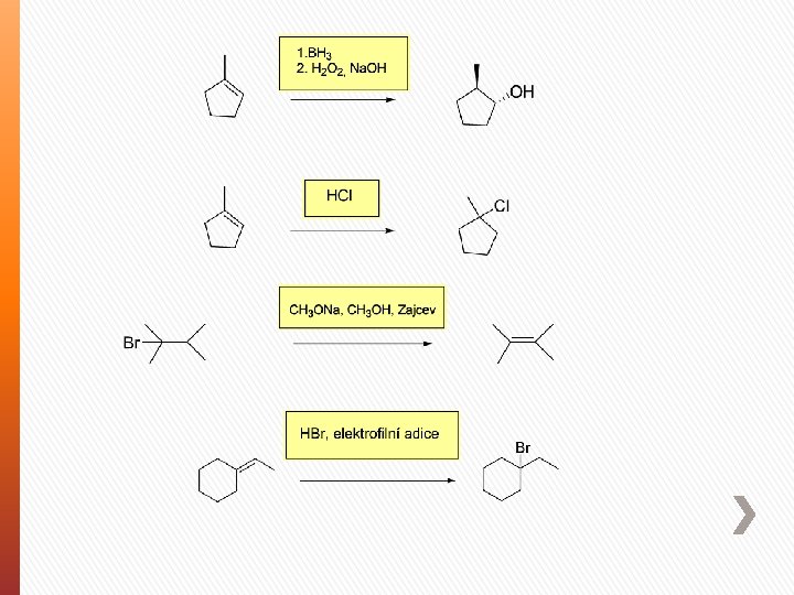 5) Halogenhydriny a halogenethery anti-adice bromoniový intermediát! 6) Oxymerkurace - demerkurace regioselektivita stejná jako u kysele katalyzované adice vody 7) Hydroborace stereospecifická (syn) regioselektivní anti. Markovnikovova adice