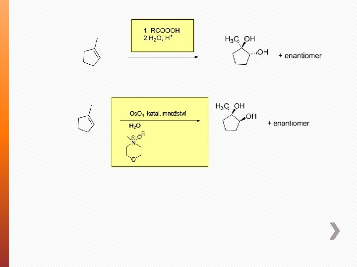 8) Oxidace a) vznik oxacyklopropanového kruhu b) vicinální syn-dihydroxylace stereospecifická syn -adice c) vicinální anti-dihydroxylace