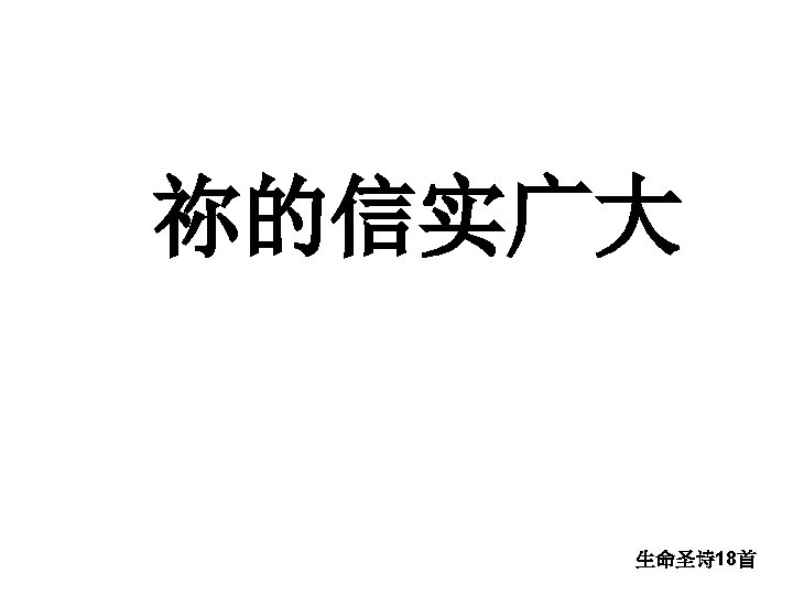 副歌 Refrain 祢的信实广大, 祢的信实广大 , Great is Thy faithfulness! 清晨复清晨, 更经历新恩; Morning by morning new mercies I see. 我所需用祢恩手丰富预备, All I have needed Thy hand hath provided; 祢的信实广大, 显在我身。