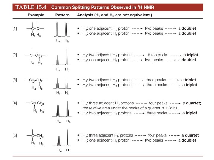 Rules for predicting splitting patterns 1. Equivalent protons do not split each other’s signals. 2. A set of n nonequivalent protons splits the signal of a nearby proton into n + 1 peaks. 3. Splitting is observed for nonequivalent protons on the same carbon or adjacent carbons. If Ha and Hb are not equivalent, splitting is observed when: