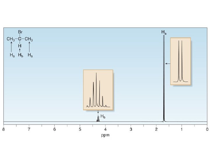 Peak ratios in a multiplet. • Doublet – The two spin states of the proton causing splitting are nearly equally populated (because the energy difference is so small). Therefore a doublet is has a peak ratio of 1: 1. • Triplet - Because there are two different ways to align one proton with B 0, and one proton against B 0—that is, a b and a b—the middle peak of the triplet is twice as intense as the two outer peaks, making the ratio of the areas under the three peaks 1: 2: 1. • Higher – use Pascals triangle