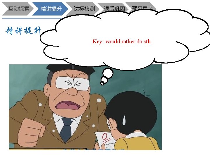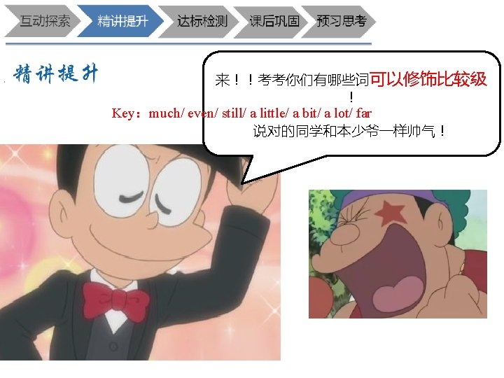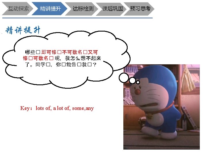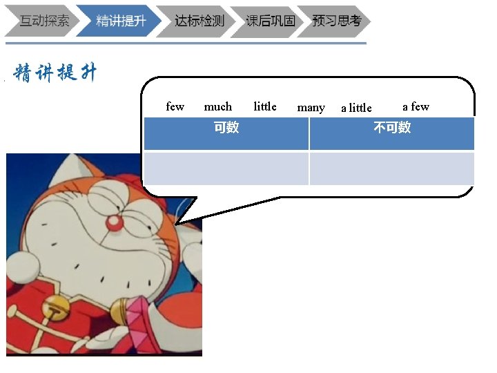 D 1. He always wears____ uniform at school. A. a B. an C. the D. / D 2. A: ____ does it take you to get to the supermarket? B: About 10 minutes. A. How many B. How far 来,练一练吧 C. How soon D. How long B 3. Mum spends one hour____ food every day. A. to cook B. cooking C. cook D. cooked B 4. I don't like the color. Please show me____ coat. A. other B. another C. the other D. others