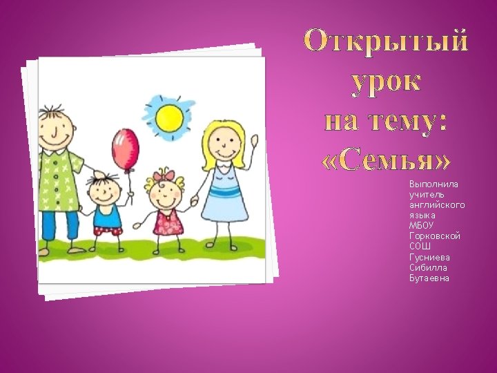 А. Dear children, let’s try to guess the topic of our lesson. Look at the blackboard. Here you can see a crossword puzzle. If you guess all the words correctly, you, ll be able to name the topic of our lesson. 1. He is the father of your father. 2. She is the sister of your father. 3. She is the mother of your sister. 4. She is the daughter of your mother. 5. He is the brother of your mother. 6. You and your parents. G F R A A N D F A T H A U N T M O T S I S T E U N C L M I L Y E R H E R