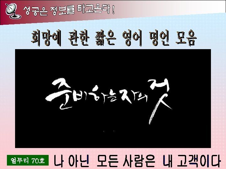108. To conceal ignorance is to increase it. An honest confession of it, however, gives ground for the hope that it will diminish some day or the other. (Mahatma Gandhi) 무지함을 숨기는 것은 곧 그것을 늘리는 것이다. 하지만 무지함에 대한 정직한 고백은 언젠가는 그것이 줄어들 것이라는 희망의 기반을 마련해 준다. (마하트마 간디) 109. Tomorrow is the most important thing in life. Comes into us at midnight very clean. It's perfect when it arrives and it puts itself in our hands. It hopes we've learned something from yesterday. (John Wayne) 내일은 상태로 손으로 내일은 인생에서 가장 중요한 것이다. 자정이 되면 내일은 매우 깨끗한 우리에게 다가온다. 매우 완벽한 모습으로 우리 곁으로 와 우리 들어온다. 우리가 어제에서 뭔가를 배웠기를 희망한다. (존 웨인) ☎ You can't have what you don't want. 네가 원하지 않은 것은 가질 수 없다. ☏ Today is the first day of the rest of your life. 오늘은 당신의 남은 인생의 첫 번째 날이다.