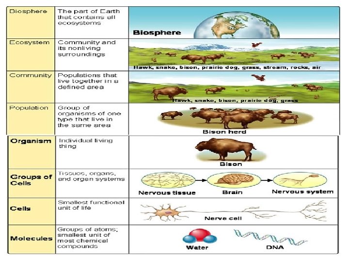 • Ecology - the branch of biology that deals with the interactions between organisms and their environment • Biodiversity – • Population - includes all the members of a species in a given area ex. all of the white tail deer in the Adirondacks is a population • Organism – a living thing • Biome – the biosphere is organized into smaller parts called biome • Community - all of the populations in a given area. E. g. deers, dogs • Niche - • Ecosystem – the living (biotic) community and the nonliving (abiotic) physical environment functioning together is an ecosystem • Biosphere - is the portion of the earth in which LIFE exists s made up of many complex ecosystems. * ALL OF THE ECOSYSTEMS COMBINED MAKE UP THE BIOSPHERE!