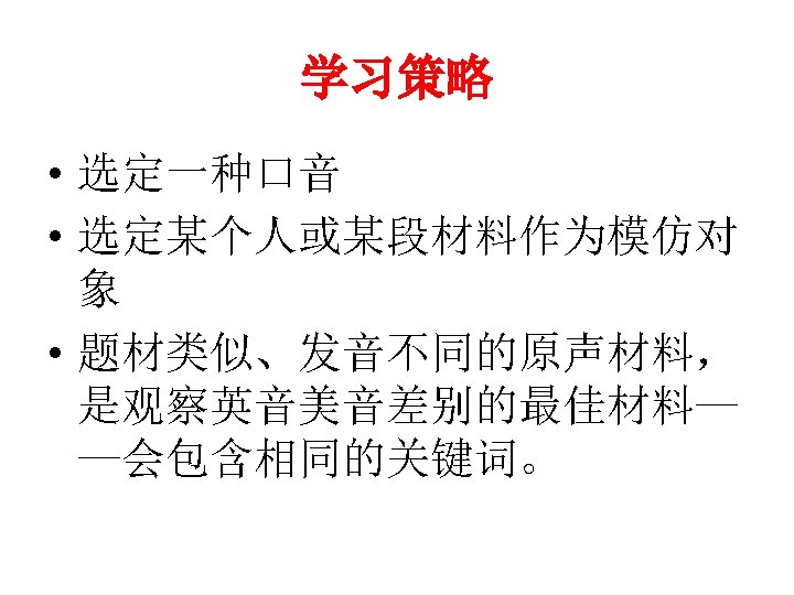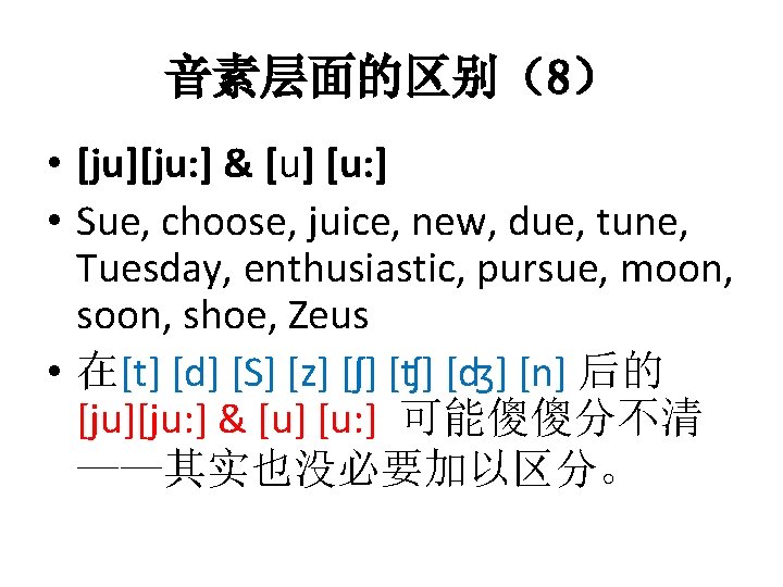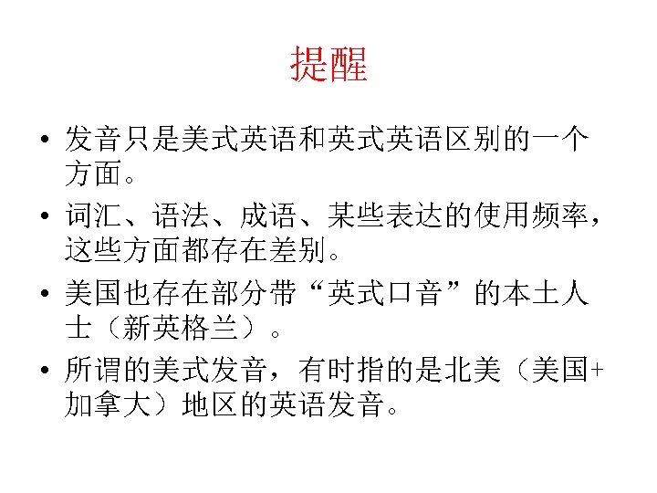 音素层面的区别(7) • [а. U] • Loud, shout, doubt, allow, brow, how, about, power, sour, hour, found, sound, bound • [о] VS. [əu] • Old, ocean, know, bone, joke, smoke, radio, slow, glow, told, cold, folk, goal, soul