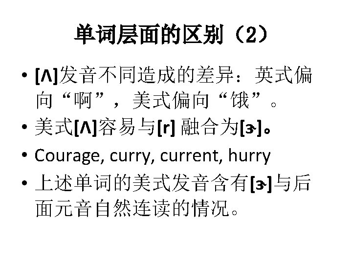 单词层面的区别(1) • 美式 [æ] VS. 英式 [ɑ: ] • Pass, past, master, cast, fast, last, ask, task, vast, command, demand, half, dance, chance, advantage, laugh, staff, aunt