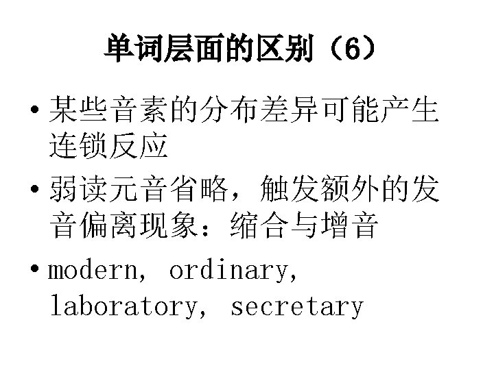 音素层面的区别(5) • [ɔ] VS. [ɔ: ] • Walk, talk, law, saw, cause, flaw, caught, taught, daughter, automobile, brought • [ɑ] VS. [ɔ][ɒ] • Body, hot, dog, shot, shop, shock, problem, drop, qualify, rock, wash, watch, topic