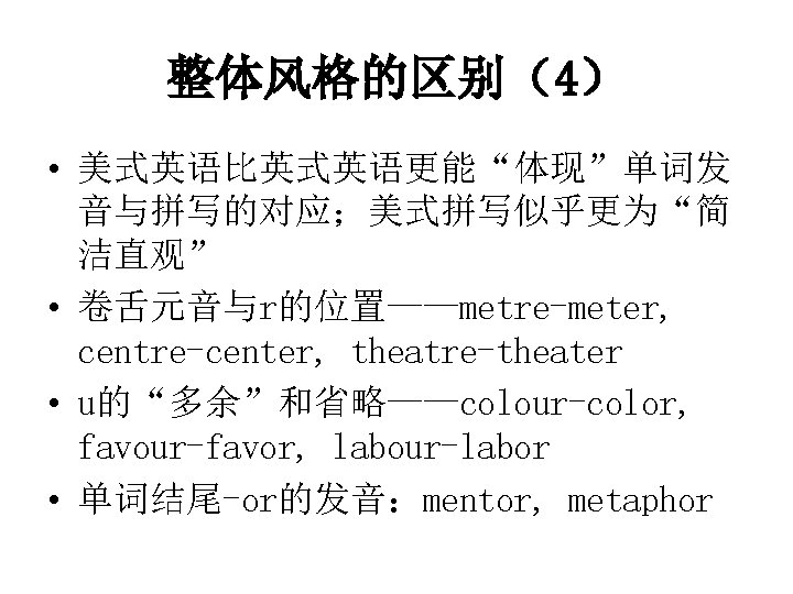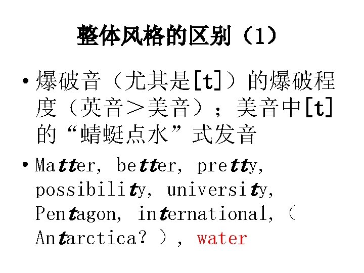 ![整体风格的区别(2) • 鼻音的浓厚程度(美音(twangy)> 英音);在[ɛ][æ][аʊ][а. I]的鼻化元 音中尤其明显 • Can, fan, span, ran, ban, cram, spam, 整体风格的区别(2) • 鼻音的浓厚程度(美音(twangy)> 英音);在[ɛ][æ][аʊ][а. I]的鼻化元 音中尤其明显 • Can, fan, span, ran, ban, cram, spam,](https://slidetodoc.com/presentation_image/11094b60bf60a3d1479c8f07fcb8fcc7/image-23.jpg)