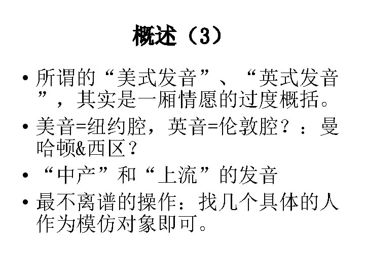 概述(1) • 个人—社团—民族——语言的个性、 共性与变体:How many people speak the same language even when they are speaking the same language? • “标准语言”和方言——子虚乌有的 “标准语言”:A standard language is a dialect with an army and a navy.