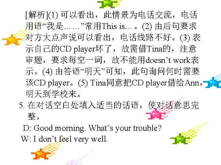Ann: Hello. Is Tina there? Tina: Hello, Ann. ____is This Tina. Ann: Could I borrow your CD player tomorrow, please? Tina: Sorry. It’s not a very good____. line Could you speak more loudly, please? Ann: Sure. I said, could I borrow your CD player, please? Mine is______. broken Tina: Of course. When _____do you want it? Ann: Tomorrow if possible. Tina: OK, I’ll _____it bring to school in the morning. Ann: Thanks! Bye.