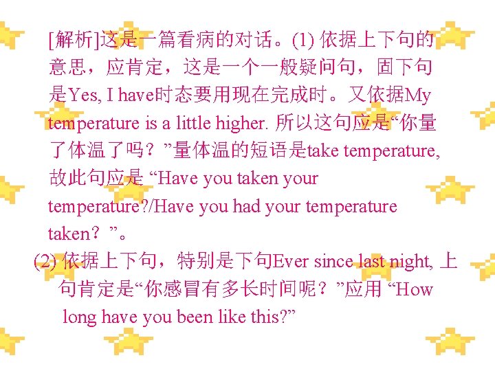 you taken your temperature? / Have you had D: Have ____________________ your temperature taken? ____________________ W: Yes, I have. My temperature is a little higher. D: Open your mouth and say “Ah”. W: Ah. D: ___________________ How long have you been like this? W: Ever since last night. D. Did you sleep well? W: No. I was very tired last night. D: Oh, I see. You’ve ________________ got a cold. /You’ve caught a __________________ bad cold. /You’ve had a bit of cold. W: Can you tell me how I got a cold?