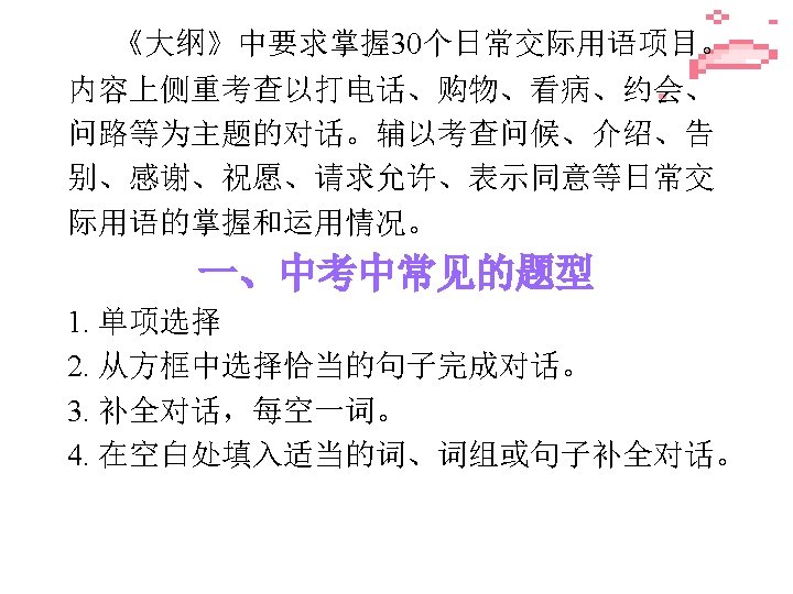 四、巩固练习 1. —May I speak to John? B —____ A. Do you know him? B. Yes, this is John speaking. C. Yes, I am John. D, I’m speaking. 2. —May I borrow your ruler? C —Certainly. ____. A. Hold on, please B. It doesn’t matter C. Here you are D. Not at all
