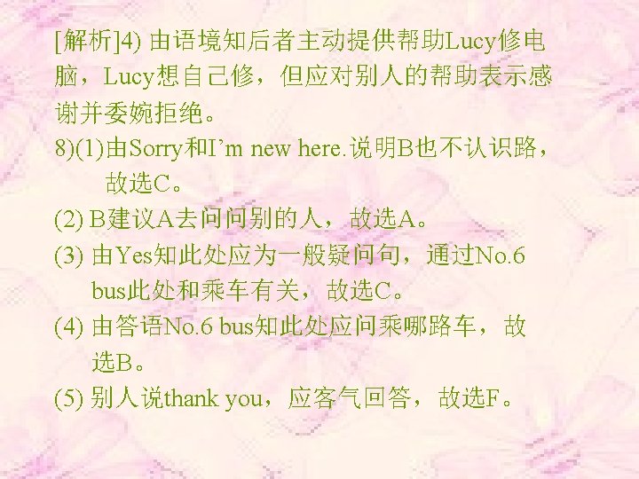 3. —Congratulations to you on passing the maths exam. —____. D A. You’re welcome B. Never mind C. Don’t mention it D. Thanks a lot 4. —Lucy, let me help you fix your computer. —____. B I can manage it myself. A. That’s OK B. No, thanks C. Perhaps not D. Not at all 5. —Let’s chat online. —____. D A. Not at all B. Thank you C. Good luck D. Good idea