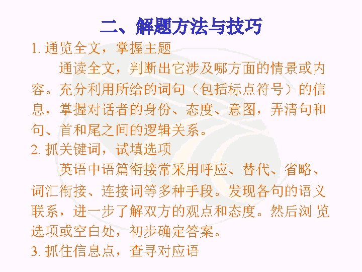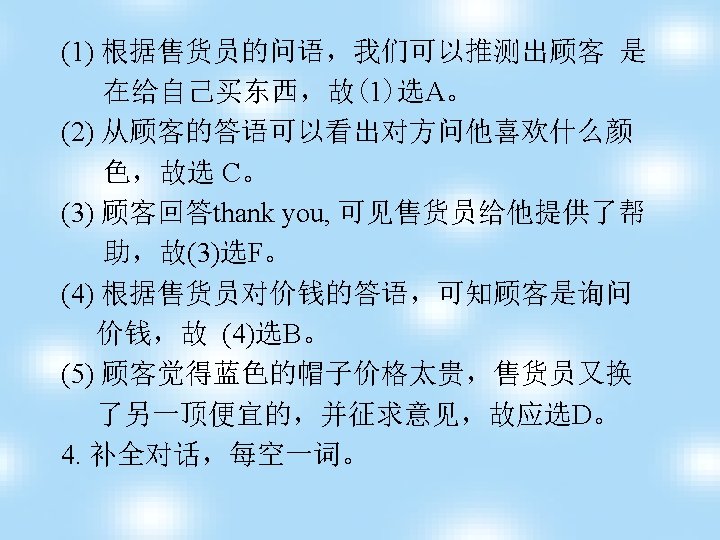 B: Thank you. (4) A: One hundred yuan. B: Oh, it costs too much. A: (5) It’s cheaper, It’s only fifty yuan. B: OK. I’ll take it. Thank you. A. I want to buy a hat for myself. B. How much is it? C. What colour do you want? D. What about this one? E. What size do you want? F. OK. Here you are. G. It’s beautiful, isn’t it? [解析]做题时我们要冷静分析语言情景,联系上 下文以及前后逻辑,采用“各个击破”的方法。 首 先我们可以看出这是一段购物的对话。