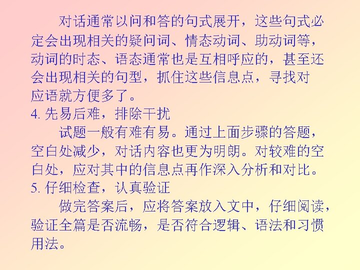 (3) 依据上下文,及全文的意思,此空应是“你得 了感冒。”因在下一句,说了 “Can you tell mehow I got a cold? ” 所以此句应填 “You’ve got a cold. /You’ve caught a bad cold. /You’ve had a bit of cold. ”。 (4) 依据上下句,特别是下句No, I don’t think it is too serious. 所以此处应是“我的感冒严重吗?” 应填 “Is it serious? /Is that rather serous? ” (5) 依据上下句,上句是take this medicine, 下句是 Three times a day. 所以应填 “How often do I take this medicine? /How often must I take the medicine? ”