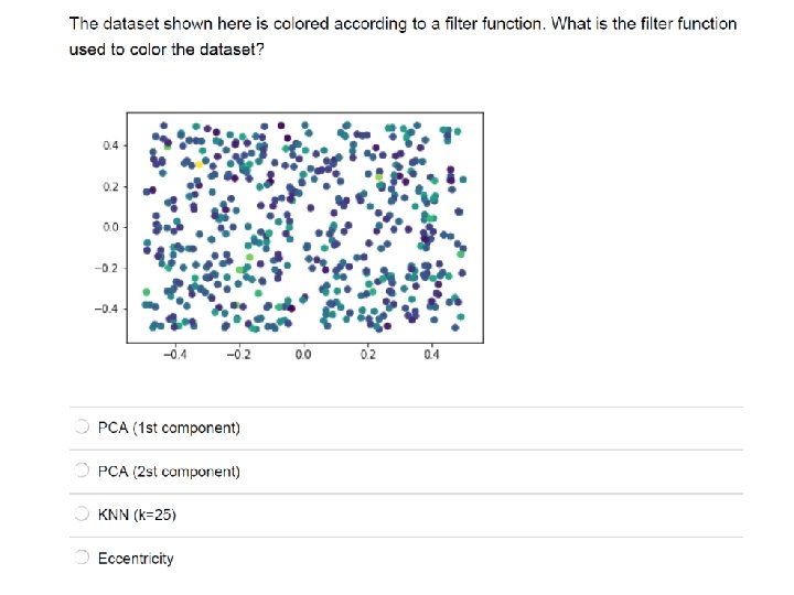 Note: Many, many choices were made “It is useful to think of it as a camera, with lens adjustments and other settings. A different filter function may generate a network with a different shape, thus allowing one to explore the data from a different mathematical perspective. ” http: //www. nature. com/srep/2013/130207/srep 01236/full/srep 01236. html