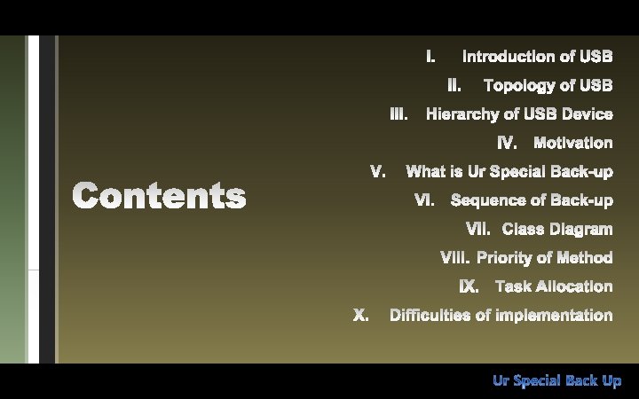 Task allocation Ø 임혁준 - print. USBStack() * print. Device. Descriptor(); * print. Device. Descriptor. JUSB() * print. Configuration. Descriptor(); * print. Interface. Descriptors(); * print. Endpoint. Descriptors(); Ø 성노섭 - setup. Gui(); - setup. Text. Gui(); - get. GUID() - Copy. To() - Copy. From() - Controller. USBListener * device. Removed() * device. Addes()