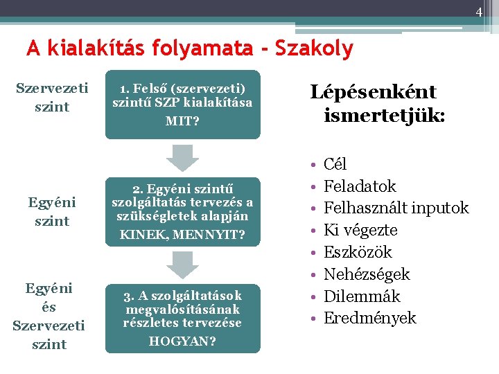 4 A kialakítás folyamata - Szakoly Szervezeti szint 1. Felső (szervezeti) szintű SZP kialakítása MIT? Egyéni szint 2. Egyéni szintű szolgáltatás tervezés a szükségletek alapján KINEK, MENNYIT? Egyéni és Szervezeti szint 3. A szolgáltatások megvalósításának részletes tervezése HOGYAN? Lépésenként ismertetjük: • • Cél Feladatok Felhasznált inputok Ki végezte Eszközök Nehézségek Dilemmák Eredmények