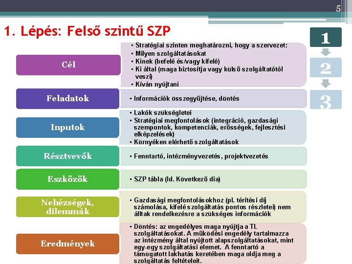 5 1. Lépés: Felső szintű SZP Cél Feladatok Inputok Résztvevők Eszközök • • 1 Stratégiai szinten meghatározni, hogy a szervezet: Milyen szolgáltatásokat Kinek (befelé és/vagy kifelé) Ki által (maga biztosítja vagy külső szolgáltatótól veszi) • Kíván nyújtani 2 • Információk összegyűjtése, döntés 3 • Lakók szükségletei • Stratégiai megfontolások (integráció, gazdasági szempontok, kompetenciák, erősségek, fejlesztési elképzelések) • Környéken elérhető szolgáltatások • Fenntartó, intézményvezetés, projektvezetés • SZP tábla (ld. Következő dia) Nehézségek, dilemmák • Gazdasági megfontolásokhoz (pl. térítési díj számolása, kifelé szolgáltatás pontos részletei) nem álltak rendelkezésre a szükséges információk Eredmények • Döntés: az engedélyes maga nyújtja a TL szolgáltatásokat. A működési engedély tartalmazza az intézmény által nyújtott alapszolgáltatásokat, mint egy-egy szolgáltatási elemet. A fenntartó a támogatott lakhatás keretében maga oldja meg a szolgáltatás feltételeit.