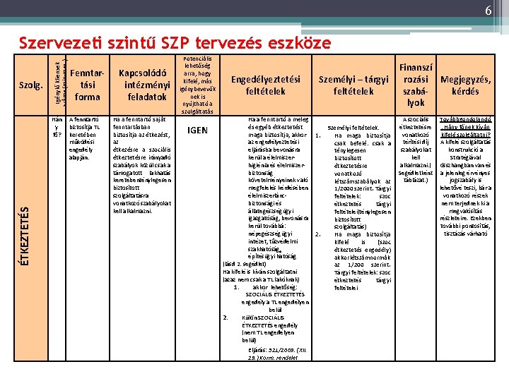 6 Szolg. Igénylő kliensek száma (min-max. ) Szervezeti szintű SZP tervezés eszköze ÉTKEZTETÉS Hán y fő? Fenntartási forma A fenntartó biztosítja TL keretében működési engedély alapján. Kapcsolódó intézményi feladatok Ha a fenntartó saját fenntartásban biztosítja az étkezést, az étkezésre a szociális étkeztetésre irányadó szabályok közül csak a támogatott lakhatás keretébenténylegesen biztosított szolgáltatásra vonatkozó szabályokat kell alkalmazni. Potenciális lehetőség arra, hogy kifelé, más igénybevevők nek is nyújtható a szolgáltatás IGEN Engedélyeztetési feltételek Ha a fenntartó a meleg és egyéb étkeztetést maga biztosítja, akkor az engedélyeztetési eljárásba bevonásra kerül a élelmiszerhigiénia és élelmiszerbiztonság követelményeinek való megfelelés kérdésében élelmiszerláncbiztonsági és állategészségügyi igazgatóság, bevonásra kerül továbbá: népegészségügyi intézet, tűzvédelmi szakhatóság, építésügyi hatóság (lásd 2. segédlet) Ha kifelé is kíván szolgáltatni (azaz nem csak a TL lakóknak) 1. akkor lehetőség: SZOCIÁLIS ÉTKEZTETÉS engedély a TL engedélyen belül 2. Külön SZOCIÁLIS ÉTKEZTETÉS engedély (nem TL engedélyen belül) Eljárás: 321/2009. (XII. 29. ) Korm. rendelet Személyi – tárgyi feltételek 1. 2. Személyi feltételek: Ha maga biztosítja csak befelé: csak a ténylegesen biztosított étkeztetésre vonatkozó létszámszabályok az 1/2000 szerint. Tárgyi feltételek: szoc étkeztetés tárgyi feltételei(ténylegesen biztosított szolgáltatás) Ha maga biztosítja kifelé is (szoc étkeztetés engedély) akkor létszámnormák az 1/200 szerint. Tárgyi feltételek: szoc étkeztetés tárgyi feltételei Finanszí rozási Megjegyzés, szabákérdés lyok A szociális étkeztetésre vonatkozó térítési díj szabályokat kell alkalmazni. ( Segédletként táblázat. ) Továbbgondolandó : Hány főnek kíván kifelé szolgáltatni? A kifelé szolgáltatás konstrukció a Stratégiával összhangban van és a jelenleg érvényes jogszabály is lehetővé teszi, bár a vonatkozó részek nem terjednek ki a megvalósítás részleteire. Ezekben további pontosítás, tisztázás várható
