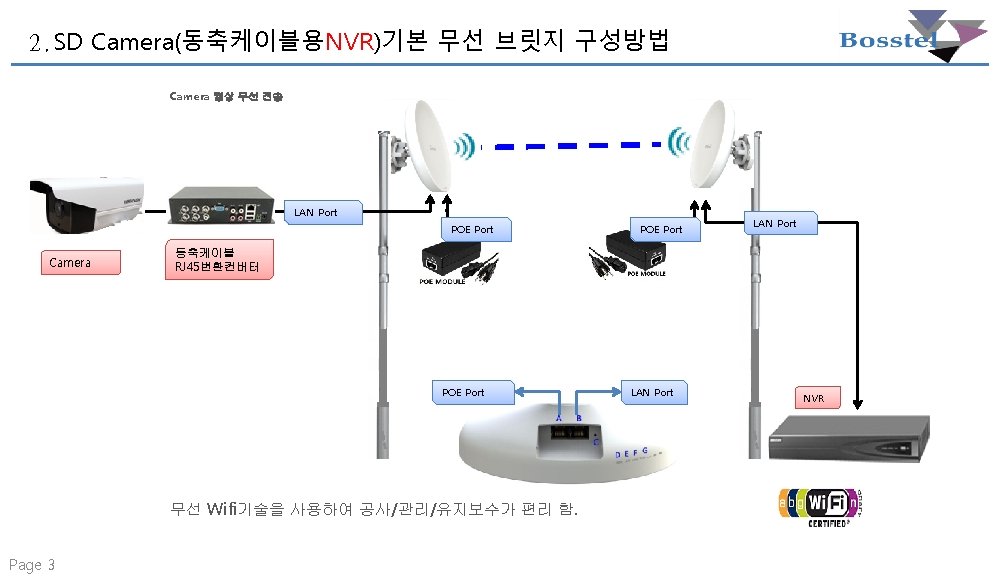 1 IP Camera Camera LAN Port POE Port Slides: 12 Download presentation 1. IP Camera기본 무선 브릿지 구성방법 Camera 영상 무선 전송 LAN Port POE Port LAN Port Camera POE Port 무선 Wifi기술을 사용하여 공사/관리/유지보수가 편리 함. Page 2 LAN Port NVR