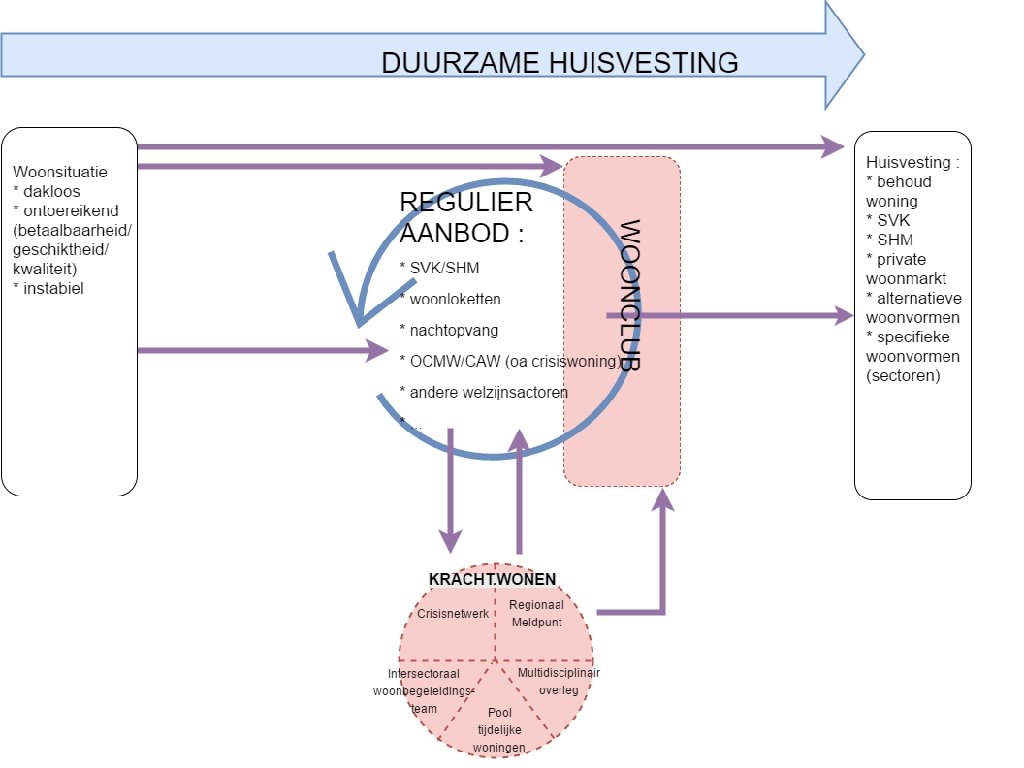 Kracht. wonen : wat is het ? 1. Regionaal meldpunt die match maakt tussen vraag en aanbod (woning – begeleiding) indien regulier/lokaal geen oplossing. 2. Regionale pool tijdelijke woningen 3. Flexibele (intersectorale) begeleidingstrajecten ifv zelfstandig wonen én duurzame huisvesting 4. Coördinatie samenwerkingsscenario én link met actieplan wonen