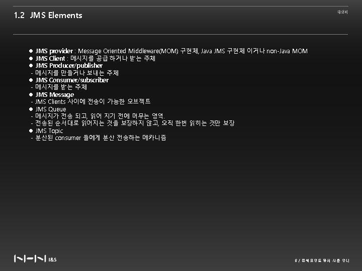 1. 4 Java Message Service 대외비 Interacting JMS API Message Brokers Like JDBC API JDBC Drivers Javax. jms. Connection. Factory Javax. jms. Connection Javax. jms. Sesssion Broker와 클라이언트 간의 상호 작용을 책임지고, 메시지를 주고 받는 것을 허락 8 / 파워포인트 문서 사용 안내