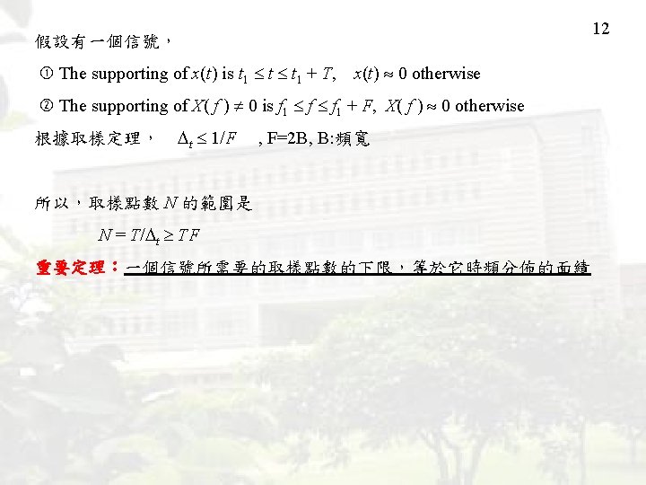 11 Conventional Sampling Theory Nyquist Criterion New Sampling Theory (1) t can vary with time (2) Number of sampling points == Area of time frequency distribution
