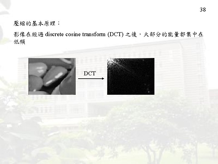 37 5. Image Compression Conventional JPEG method: Separate the original image into many 8*8 blocks, then using the DCT to code each blocks. DCT: discrete cosine transform PS: 感謝 2008年畢業的黃俊德同學
