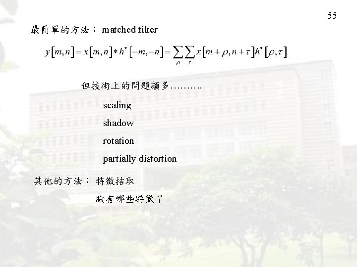 8. Pattern Recognition including face recognition character recognition 應用很廣: security, identification, computer vision ………… 54