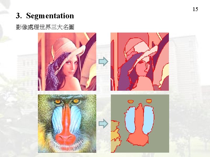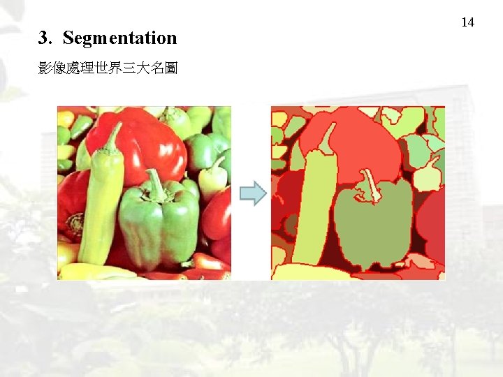3. Segmentation Important for compression biomedical engineering object identification 要學習的項目: (1) 影像處理的基本技巧 (2) Image segmentation 程式的編寫 (3) Image segmentation 的應用 (4) 查資料和做研究的方法和技巧 12