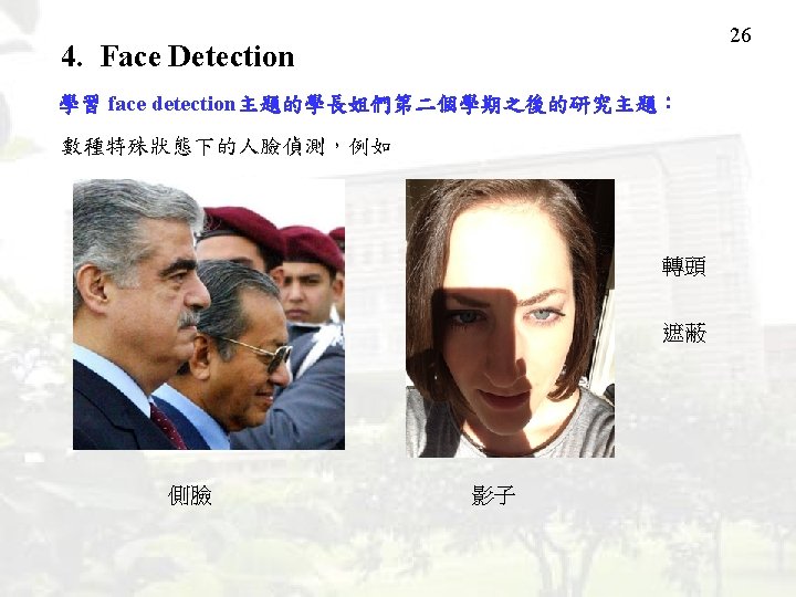 25 4. Face Detection It includes the techniques of -- feature extraction, -- image processing, -- graphics -- machine learning