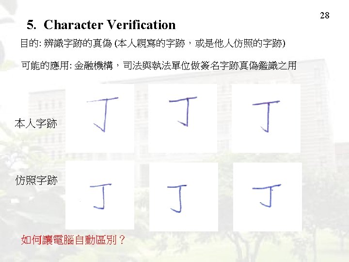 27 5. Character Verification Category “A” Category “B” Classification Clustering