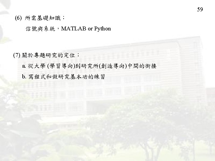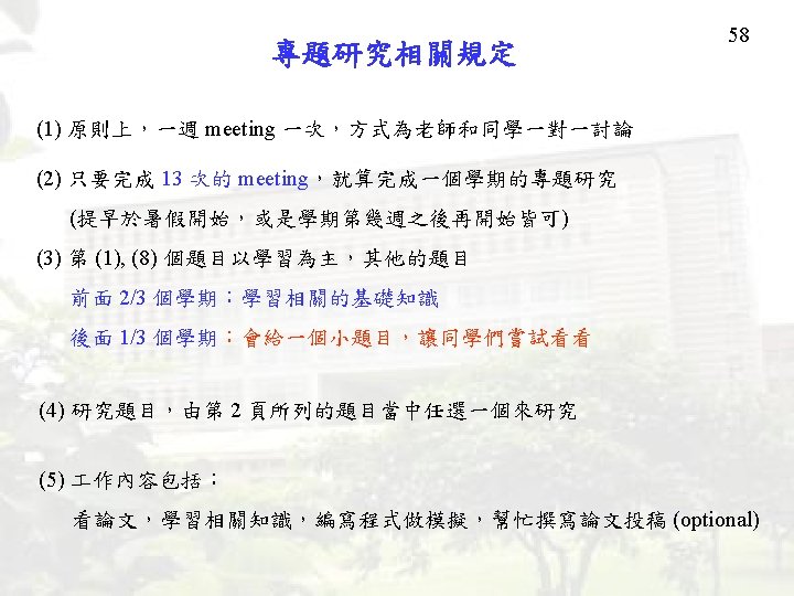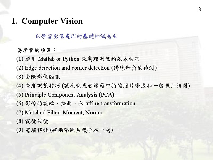 2 Research Fields (1) Computer Vision (page 3) (2) Image Compression (page 4) (3) Segmentation (page 12) (4) Face Detection (page 21) (5) Character Verification (page 27) (6) Time-Frequency Analysis (page 31) (7) Music Signal Analysis (page 42) (8) Prediction and Optimization (page 47) (9) ECG Signal Analysis (page 49) (10) Other Topics (Page 54) 專題研究相關規定 (page 58)