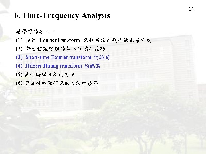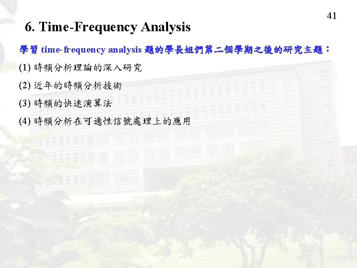 6. Time-Frequency Analysis Fourier transform (FT) Time-Domain Frequency Domain Some things make the FT not practical: (1) Only the case where t 0 t t 1 is interested. (2) Not all the signals are suitable for analyzing in the frequency domain. It is hard to analyze the signal whose instantaneous frequency varies with time. 32