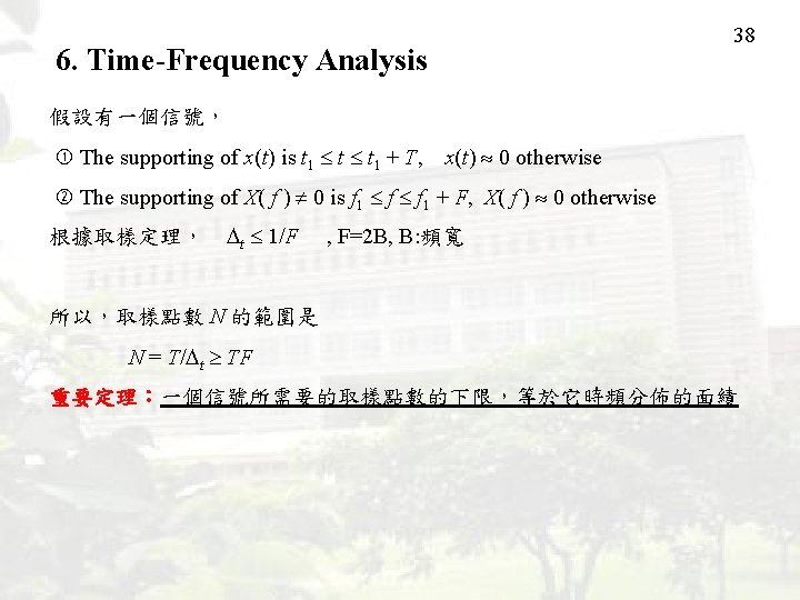 6. Time-Frequency Analysis Conventional Sampling Theory Nyquist Criterion New Sampling Theory (1) t can vary with time (2) Number of sampling points == Area of time frequency distribution 37