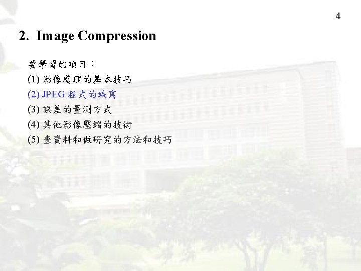 6 2. Image Compression JPEG 可將原圖壓縮至原來的 1/10 (for gray-level images) 或 1/20 (for color images) 然而人眼不易察覺壓縮前和壓縮後影像之間的差別 原圖 用 JPEG 壓成 1/30