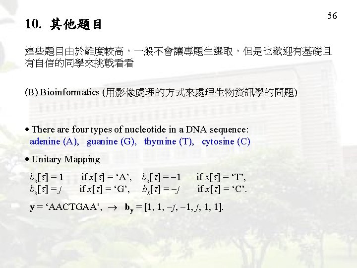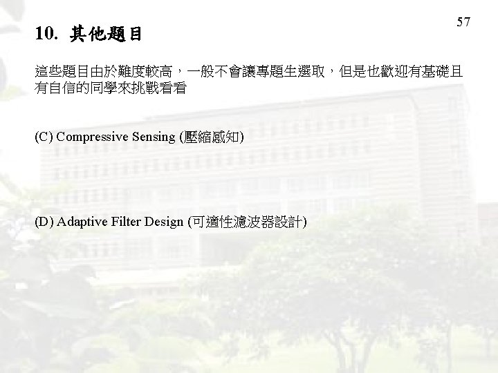 47 8. Prediction and Optimization 研究使用信號處理技術的 prediction (預測) 演算法 以及研究最佳化 (optimization) 的演算法 Prediction Techniques are important for signal analysis (信 號 分 析 ), motion prediction (動 作 預 測 ), whether forecasting (天 氣 預 測 ), economical signal prediction (經濟信號預測) ,risk accessment (風險評 估),and other applications. Optimization is important for signal analysis (信號分析), modeling (模型 建構), and machine learning (機器學習)。