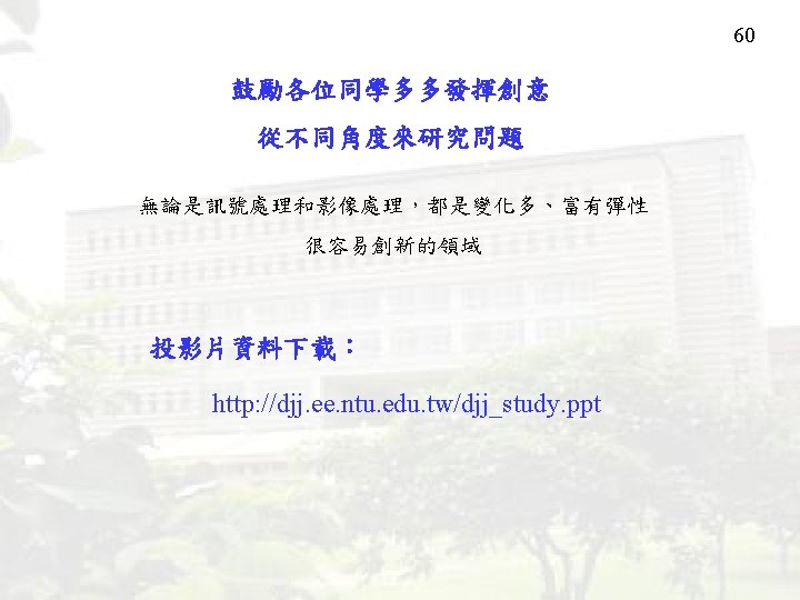 1 丁建均 (Jian-Jiun Ding) National Taiwan University 辦公室:明達館 723室, 實驗室:明達館 531室 聯絡電話: (02)33669652 組別: 通信組,資網組 Major: Digital Signal Processing Digital Image Processing E-mail: jjding@ntu. edu. tw